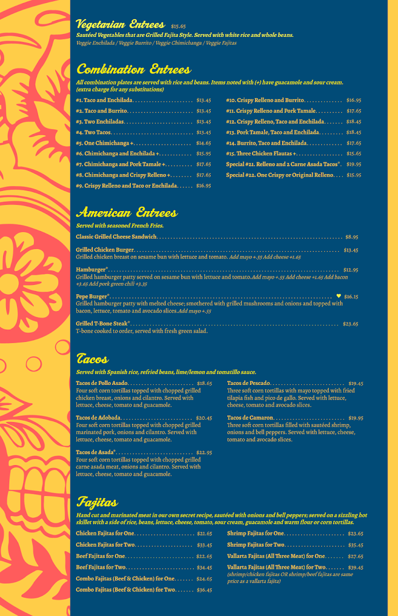 Three soft corn tortillas filled with sautéed shrimp, onions and bell peppers. Served with lettuce, cheese, tomato and avocado slices.
